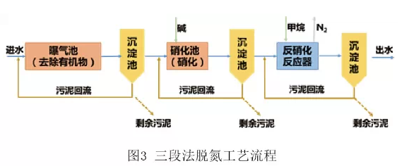 1969年,美國(guó)的Barth提出采用三段法除氮(如圖3),第一段是好氧段,主要去除有機(jī)物,第二段加堿硝化,第三段是厭氧反硝化,除氮。