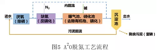70年代,美國(guó)專家在A/O工藝的基礎(chǔ)上,再加上除磷就成了A2O工藝(如圖5)。我國(guó)1986年建廠的廣州大坦沙污水處理廠,采用的就是A2O工藝,當(dāng)時(shí)的設(shè)計(jì)處理水量為15萬(wàn)噸,是當(dāng)時(shí)世界上最大的采用A2O工藝的污水處理廠。