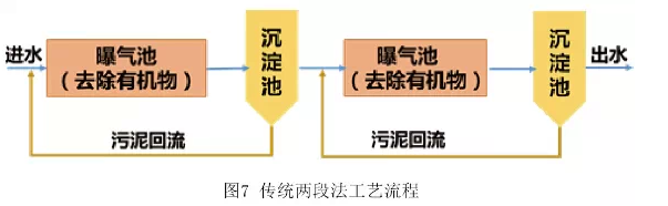 早期的兩段法只是將一套活性污泥法的兩組構(gòu)筑物串聯(lián),一段和二段曝氣池體積相同,且多合并建設(shè),大部分有機(jī)物在第一段被吸附降解,第二段的污泥負(fù)荷很低,其出水水質(zhì)要優(yōu)于相同體積曝氣池的單級(jí)活性污泥法(如圖7)。然而,由于第一段曝氣池體積減小了一倍,相當(dāng)于污泥負(fù)荷增加了一倍,處在易發(fā)生污泥膨脹的階段,運(yùn)行管理較為困難。