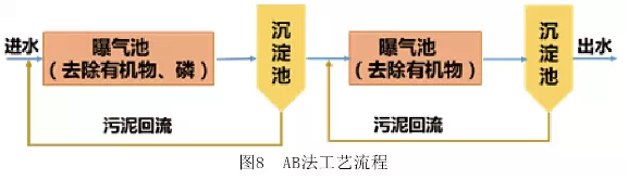 20世紀(jì)70年代中期,德國(guó)的Botho Bohnke教授開發(fā)了AB工藝(如圖8)。該工藝在傳統(tǒng)兩段法的基礎(chǔ)上進(jìn)一步提高了第一段即A段的污泥負(fù)荷,以高負(fù)荷、短泥齡的方式運(yùn)行,而B段與常規(guī)活性污泥法相似,負(fù)荷較低,泥齡較長(zhǎng),A段由于泥齡短、泥量大對(duì)磷的去除效果很好,經(jīng)A段去除了大量的有機(jī)物以后B段的體積可大大減小,其低負(fù)荷的運(yùn)行方式可提高出水水質(zhì)。但是由于A段去除了大量的有機(jī)物導(dǎo)致B段碳源缺失,所以在處理低濃度的城市污水時(shí)該工藝的優(yōu)勢(shì)并不明顯。