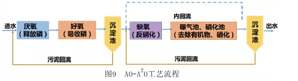 其后,為了解決脫氮時(shí)硝化菌需要長(zhǎng)泥齡,除磷時(shí)聚磷微生物需要短泥齡的矛盾,開發(fā)了AO-A2O工藝(如圖9)。該工藝由兩段相對(duì)獨(dú)立的脫氮和除磷工藝組成,第一段泥齡短,主要用于除磷,第二段泥齡長(zhǎng)、負(fù)荷低,用于脫氮。