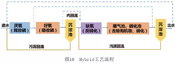 在AO-A2O工藝基礎(chǔ)上奧地利研發(fā)出了Hybrid工藝(如圖10),該工藝的兩段之間有三個(gè)內(nèi)回流裝置,可以為第一段曝氣池提供硝態(tài)氮、硝化菌以及為第二段曝氣池提供碳源。第一段主要是去除有機(jī)物和磷,第二段是硝化功能,并靠第一段曝氣池回流混合液進(jìn)行反硝化脫氮。