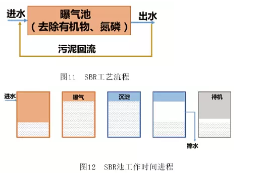 序批式活性污泥法(SBR)工藝是在時(shí)間上將厭氧段與好氧段進(jìn)行分割。20世紀(jì)70 年代初由美國(guó)Irvine公司開發(fā)。它在流程上只有一個(gè)基本單元,集調(diào)節(jié)池、曝氣池和二沉池的功能于一池,進(jìn)行水質(zhì)水量調(diào)節(jié)、微生物降解有機(jī)物和固液分離等。經(jīng)典 SBR 反應(yīng)器的運(yùn)行過(guò)程為:進(jìn)水→曝氣→沉淀→潷水→待機(jī)(如圖11、 12)。