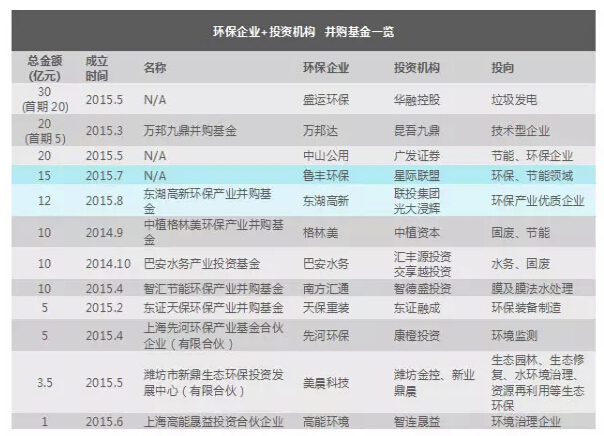 其次,資本方在環(huán)保并購市場的參與程度明顯提高。最突出的例子就是2014年以來大量出現(xiàn)的上市公司連同投資機構成立的環(huán)保并購基金。此類基金也是為并購大潮推波助瀾的力量。在標的溢價水平提高的情況下,這種基金有利于環(huán)保企業(yè)緩解資金壓力,實現(xiàn)杠桿收購。并且上市公司可以避免以自身作為直接的收購主體,在操作層面可以實現(xiàn)更加順暢和高效的收購。尤其是國資類上市公司的海外并購。截止目前約有15家上市公司聯(lián)合投資機構建立了環(huán)保并購基金,總規(guī)模已經(jīng)達到百億左右。并且不少基金已經(jīng)有所斬獲,如天保重裝對美國圣騎士環(huán)保,巴安水務對奧地利KWI公司的收購等。