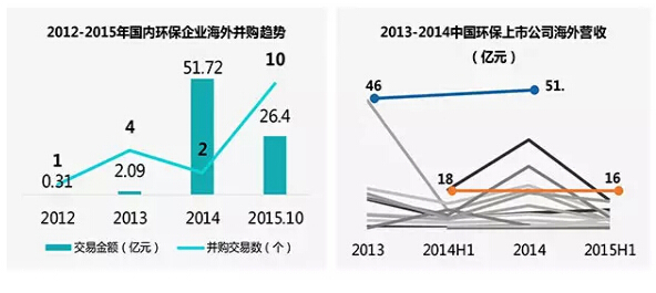 此外,“十二五”期間,環(huán)保企業(yè)在并購方面實現(xiàn)的另一個跨越是海外并購。大量企業(yè)開始將目光投向海外,完成了相當數(shù)量的海外并購。五年間累計收購的海外股權和資產(chǎn)價值接近百億元。