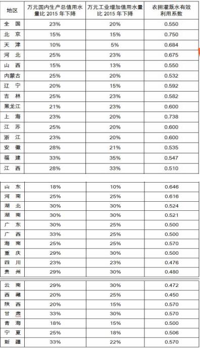嚴(yán)格強度指標(biāo)管理,把萬元國內(nèi)生產(chǎn)總值用水量、萬元工業(yè)增加值用水量和農(nóng)田灌溉水有效利用系數(shù)逐級分解到各省、市、縣,明確區(qū)域強度控制要求(各省(區(qū)、市)2020年用水強度控制目標(biāo)見附表)。2016年底前,各?。▍^(qū)、市)要力爭完成所轄市、縣用水強度控制指標(biāo)分解。到2020年,建立覆蓋主要農(nóng)作物、工業(yè)產(chǎn)品和生活服務(wù)行業(yè)的先進用水定額體系,定額實行動態(tài)修訂。嚴(yán)格用水定額和計劃管理,強化行業(yè)和產(chǎn)品用水強度控制。