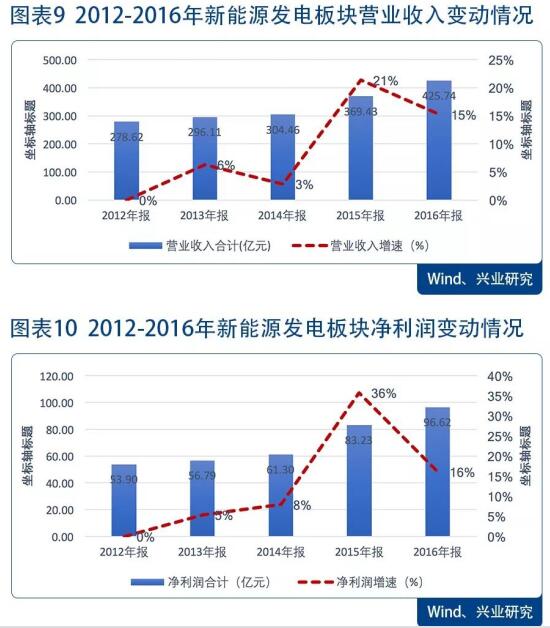 隨著新能源和可再生能源行業(yè)規(guī)模的不斷擴(kuò)大,行業(yè)的經(jīng)營(yíng)和盈利情況也保持了穩(wěn)步增長(zhǎng)。根據(jù)Wind數(shù)據(jù),新能源發(fā)電板塊(申萬行業(yè)二級(jí)分類)營(yíng)業(yè)收入從2012年至2014年間,維持小幅增長(zhǎng);而進(jìn)入2015年后,營(yíng)業(yè)收入由前一年的304.46增長(zhǎng)到了369.43億元,增速超過了20%;2016年,營(yíng)業(yè)收入合計(jì)425.74億元,雖然增速有所放緩,但依舊保持在15%的較好水平(見圖9)。而從盈利情況看,行業(yè)凈利潤(rùn)變化與營(yíng)業(yè)收入變化趨勢(shì)基本保持一致,凈利潤(rùn)在2013-2014年間,保持穩(wěn)步增長(zhǎng),2013年增速為5%,2014年增速上升到8%;而進(jìn)入2015年后,凈利潤(rùn)大幅增長(zhǎng),由前一年的61.30億元增長(zhǎng)到83.23億元,增速超過了35%;2016年,行業(yè)凈利潤(rùn)達(dá)到了96.62億元,雖然增速較2016年出現(xiàn)放緩,但依舊保持了16%的較好水平(見圖10)。