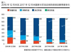 截至2017年12月末,國家示范項(xiàng)目共697個(gè),總投資1.8萬億元。其中,2014年第一批示范項(xiàng)目22個(gè)(最初為30個(gè),陸續(xù)調(diào)出8個(gè)),總投資714億元;2015年第二批示范項(xiàng)目162個(gè)(最初為206個(gè),陸續(xù)調(diào)出44個(gè)),總投資4861億元;2016年第三批示范項(xiàng)目513個(gè)(最初為516個(gè),陸續(xù)調(diào)出3個(gè)),總投資11957億元。