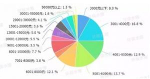 可以看出大約有30%的人薪資分布在3k~5k之間,大約30%的人薪資分布在5k~8k之間,有15%的人薪資分布在8k~12k之間,12k以上的高薪人群占比達25%左右。