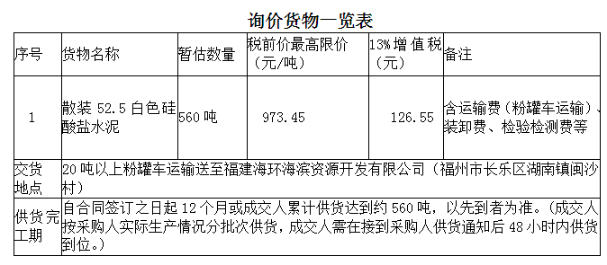 福建海峽環(huán)保集團(tuán)股份有限公司對?福建海環(huán)海濱資源開發(fā)有限公司龍峰渣土資源化利用項(xiàng)目52.5白色硅酸鹽水泥?采用公開詢價(jià)采購方式實(shí)施采購,現(xiàn)歡迎合格的報(bào)價(jià)人前來提交密封的報(bào)價(jià)。