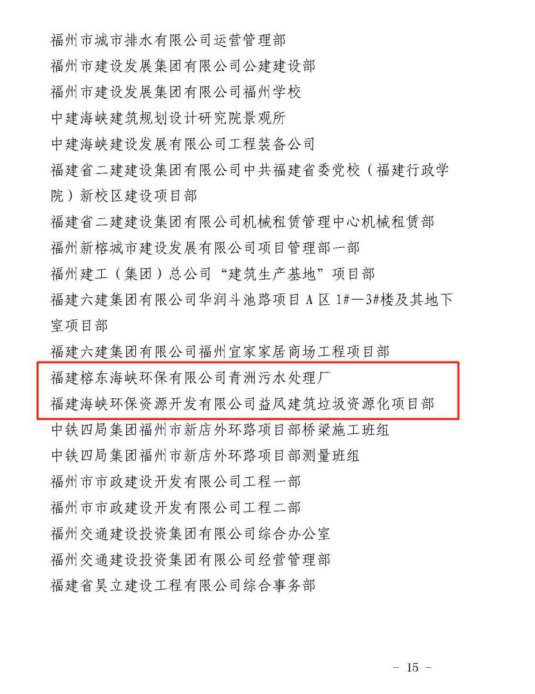 4月30日,福州市總工會授予集團下屬福建榕東海峽環(huán)保有限公司青洲污水處理廠、福建海峽環(huán)保資源開發(fā)有限公司益鳳建筑垃圾資源化項目部(以下簡稱“青洲污水廠”、“益鳳項目部”)“工人先鋒號”榮譽稱號。