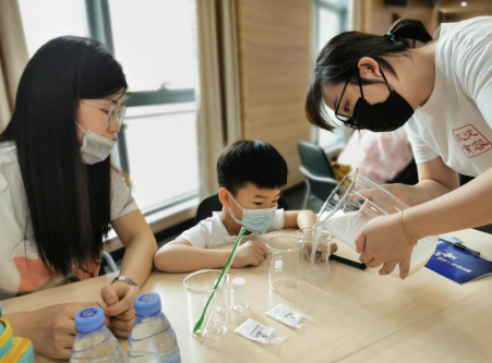 最后一行人回到辦公樓二樓的傳習(xí)所,研學(xué)機(jī)構(gòu)的老師們?yōu)楹⒆觽兙臏?zhǔn)備了實(shí)驗(yàn)器具,帶領(lǐng)孩子們動(dòng)手操作,近距離感受澄清過(guò)濾這一重要污水處理流程。
