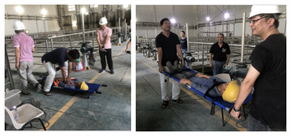 演練模擬膜池底部施工時,由于底部含氧量不足,發(fā)生了作業(yè)人員窒息事故,公司應急救援組開展應急救援的過程。經(jīng)過緊張有序的處置,“傷員”得到有效救治,事故得到有效處置。