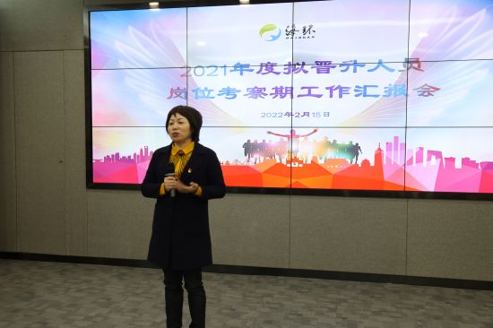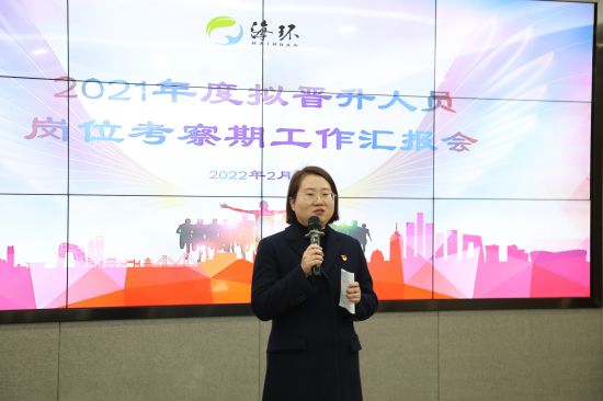 程晶對本次考察期匯報(bào)做了綜合點(diǎn)評。她指出,考察匯報(bào)會是集團(tuán)年度晉升競聘工作的完美收官。從述職匯報(bào)的情況來看,專業(yè)經(jīng)理職級、主辦職級崗位考察達(dá)到預(yù)期成效。集團(tuán)從2021年9月重新全面啟動集團(tuán)員工晉升競聘工作至今歷時近半年時間。晉升考察對象從層層晉升選拔中脫穎而出,通過三個月崗位考察,大家在各分管領(lǐng)導(dǎo)及部門負(fù)責(zé)人的指導(dǎo)下,針對性補(bǔ)給“充電”,達(dá)到了晉升適崗考察目標(biāo)。新晉員工是海環(huán)持續(xù)發(fā)展的新力代表,希望大家能保持學(xué)習(xí)力與創(chuàng)造力,多思考、消化、總結(jié)本次晉升競聘的能力測試、答辯以及崗位考察等過程中各評審及領(lǐng)導(dǎo)提出針對性問題與建議,在今后的工作中改進(jìn)與運(yùn)用。新晉員工作為公司內(nèi)部人才選拔的親歷者,也是很好的“宣講員”,希望個人成長與企業(yè)發(fā)展同頻共振,以實(shí)際行動證明海環(huán)力量。同時,本次創(chuàng)新專業(yè)人才選拔與晉升競聘工作,應(yīng)用內(nèi)外專家評審、原創(chuàng)通用專用題庫以及考察評價等舉措,希望人資部門進(jìn)一步總結(jié)復(fù)盤,更好開展公司新一輪崗位晉升與人才選拔工作。